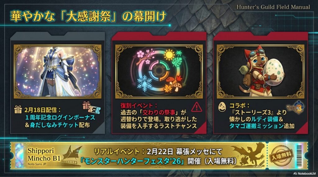 - 2月22日:幕張メッセで「モンスターハンターフェスタ’26」開催
