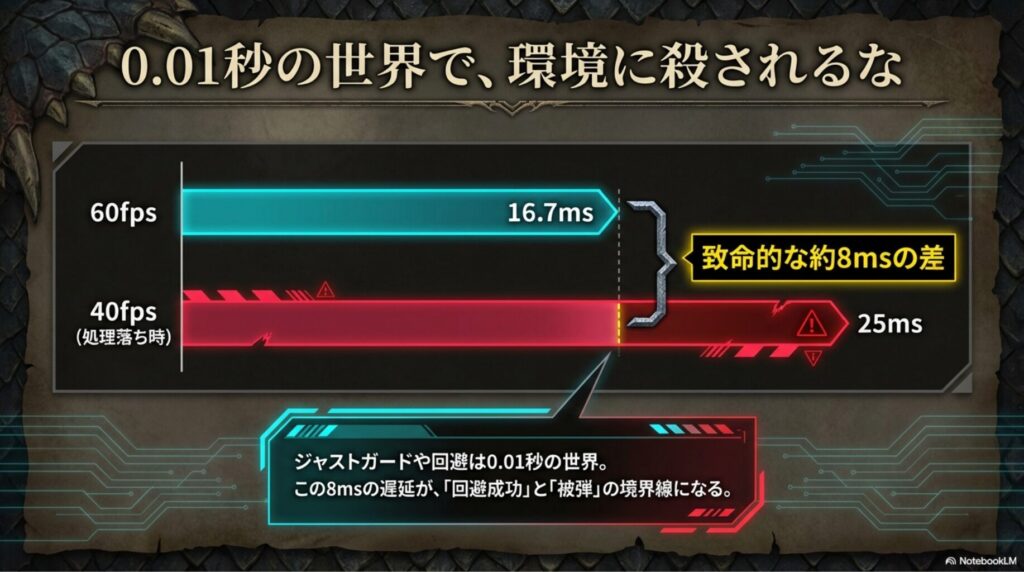 この差、約 8ミリ秒 が、「避けられるはずの攻撃を避けられない」と「ギリギリ避けられる」の境界線になります。