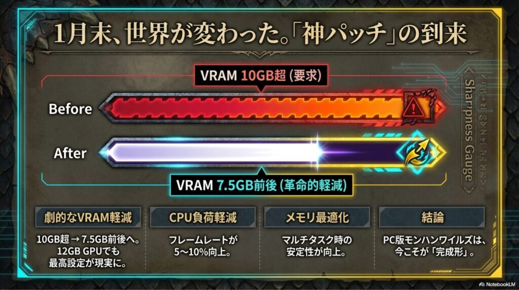 このパッチで何が変わったのか——最も重要なのは、VRAM使用量の劇的な軽減です。