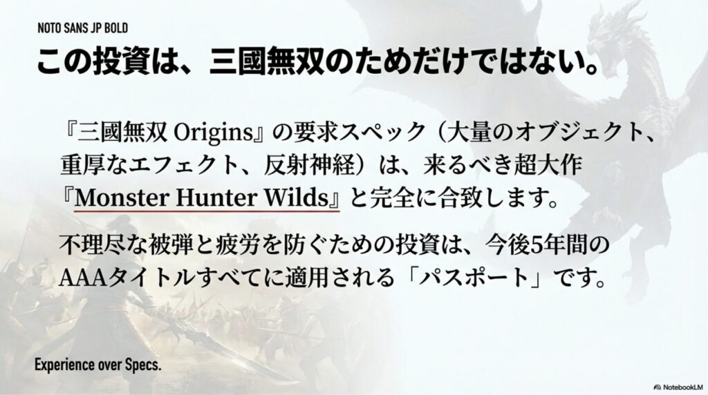 三國無双 Originsを最高環境で遊ぶためのPCスペックは、実はモンスターハンターワイルズを基準とした判断基準と共通しています。