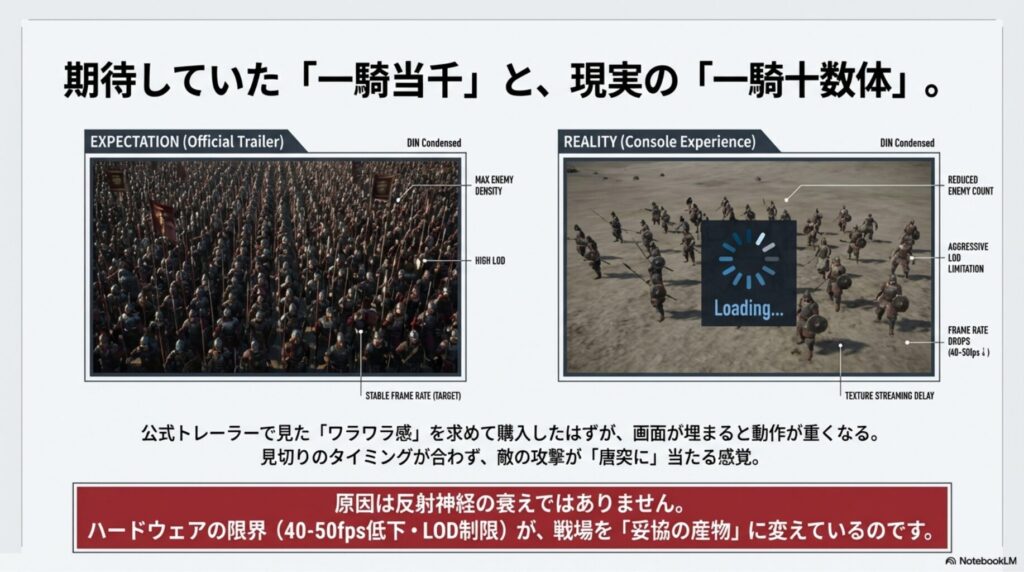 しかし、「見切り」が決まらないストレス、大軍団が消える違和感、4時間プレイ後の原因不明の疲労感——これらはすべて、フレームレートの不安定性と表示制限が原因です。