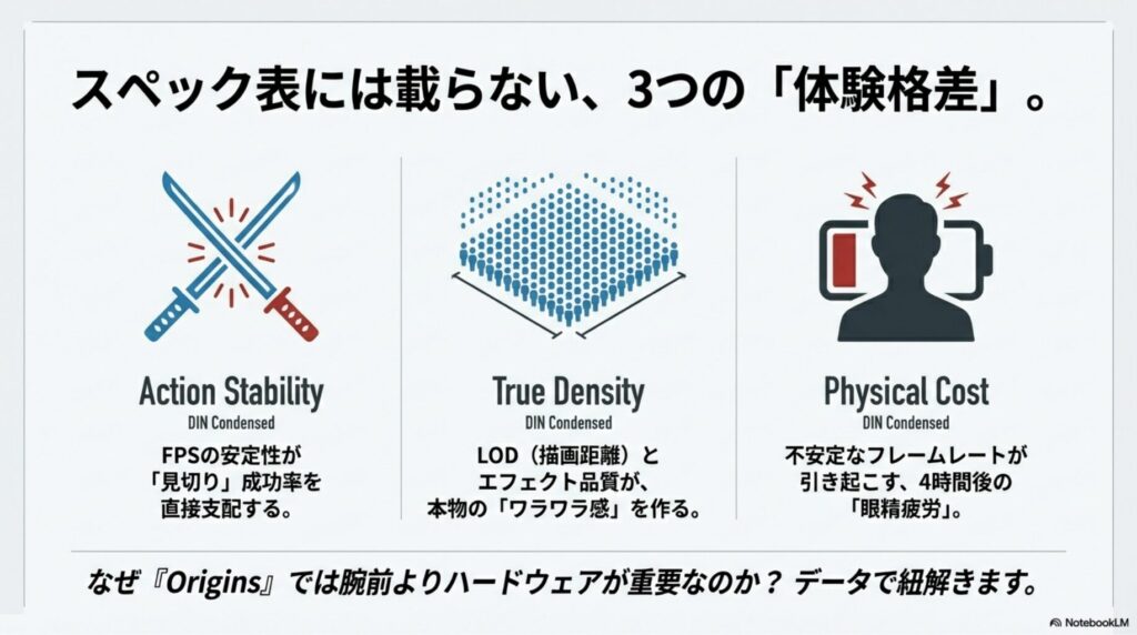 特に、カメラ回転時のカクつきは、視覚情報の処理に余計なエネルギーを消費させ、2〜3時間のプレイで眼精疲労と集中力の低下を引き起こします。