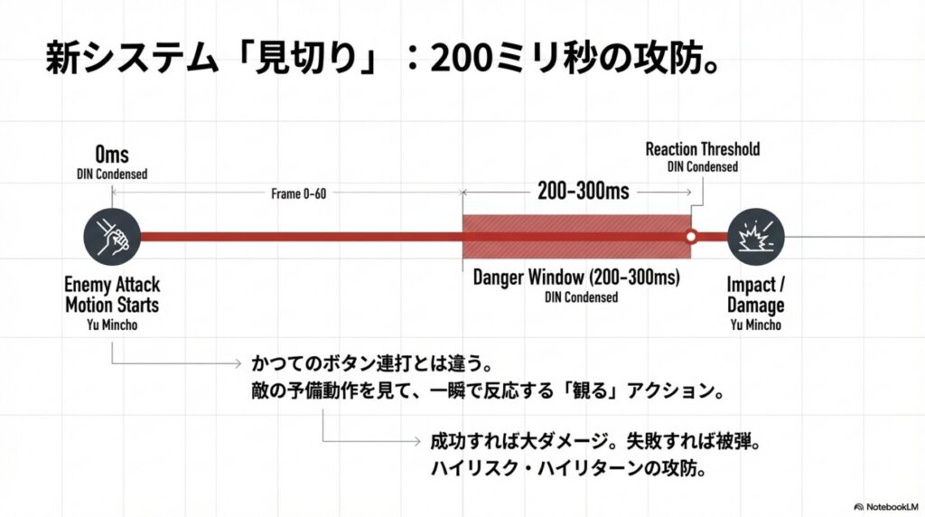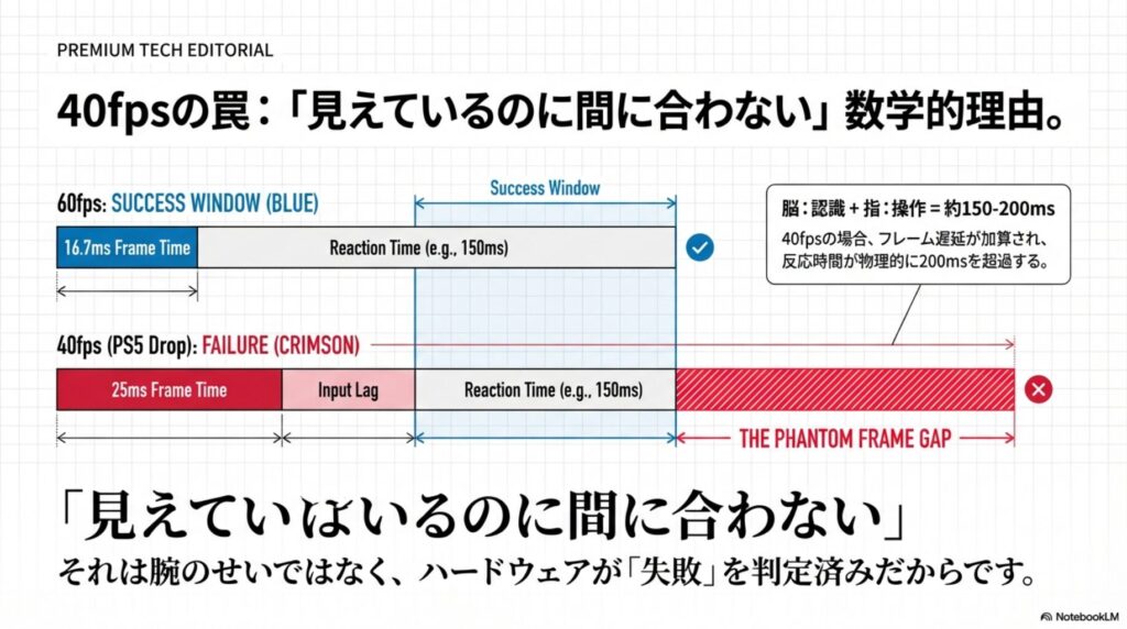 「たかが数十fps」と思うかもしれませんが、今作の核心システム「見切り・パリィ」は、敵の攻撃モーションを視認してから反応するまで、わずか200〜300ミリ秒の猶予しかありません。