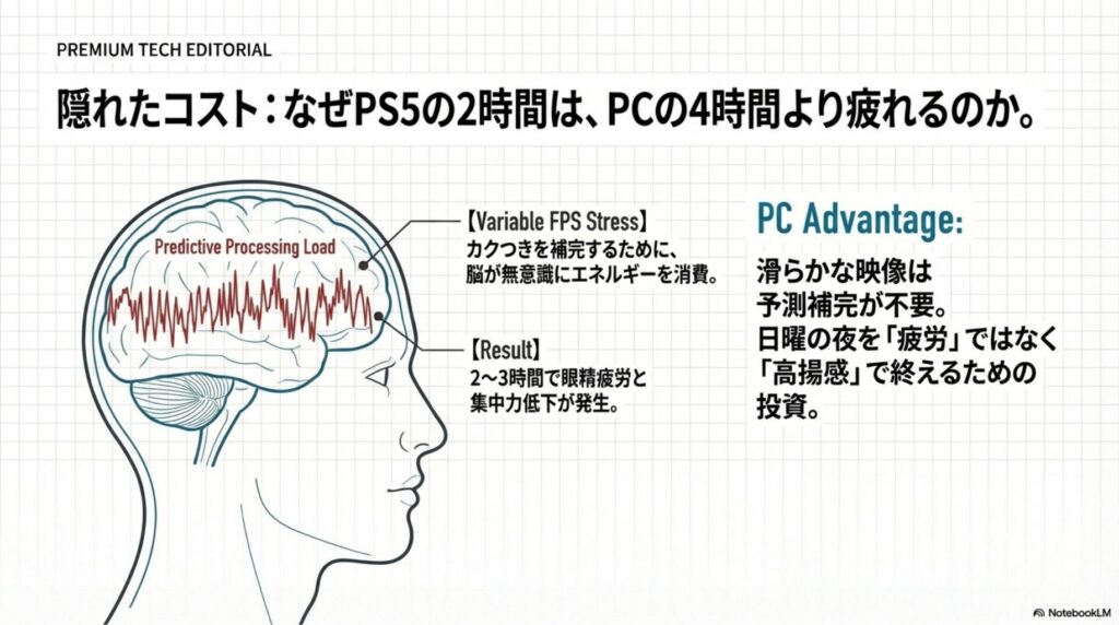 PS5版では、fpsが不安定なため、脳が無意識に「次のフレーム」を予測しようとする負荷がかかります。