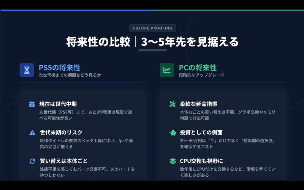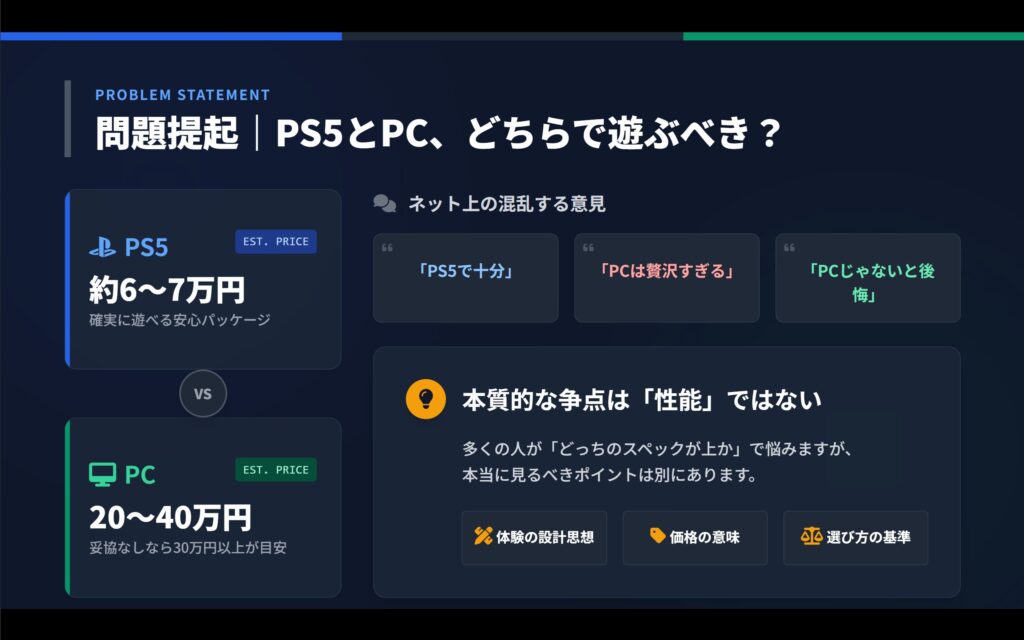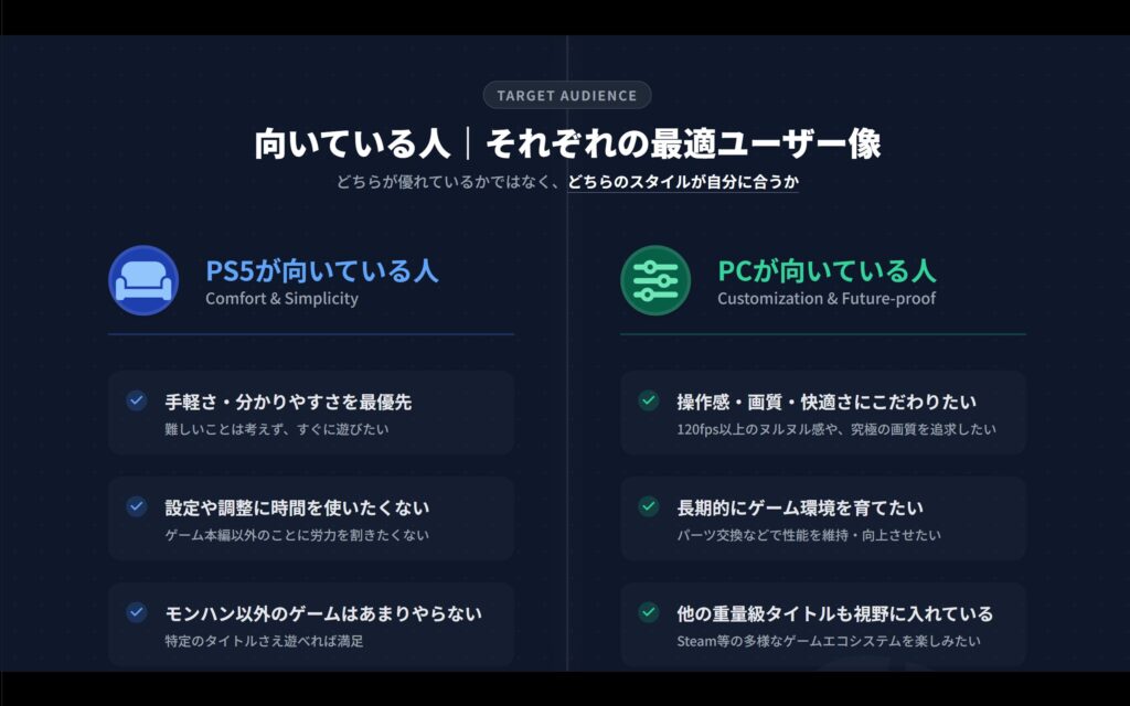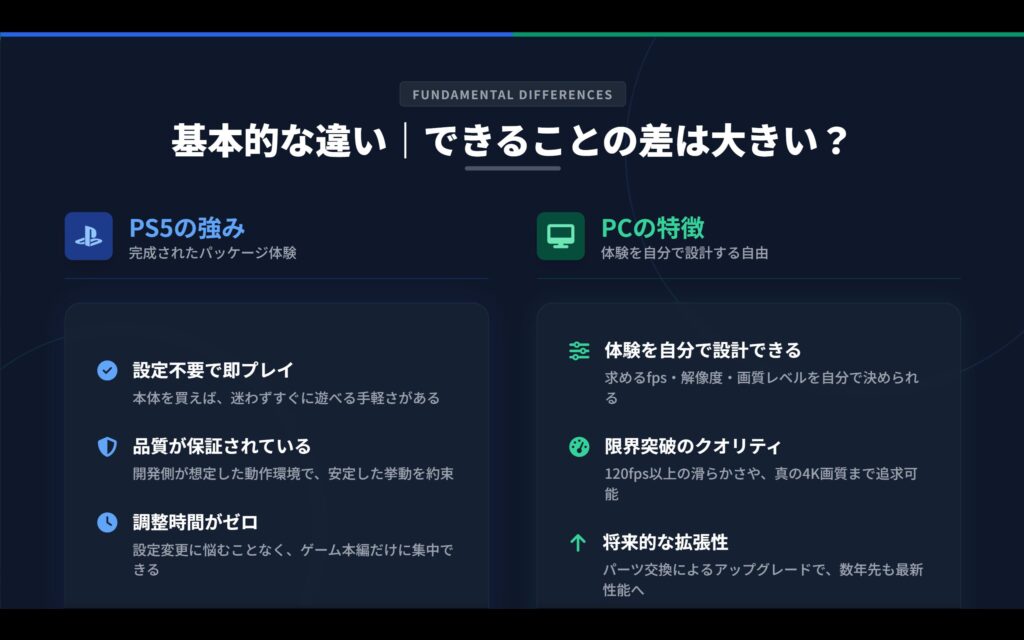 多くの比較記事が見落としているのは、 PS5とPCの違いは「性能の優劣」ではないということです。
