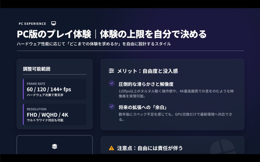 PC版では、 ハードウェア性能に応じて体験を調整できます。