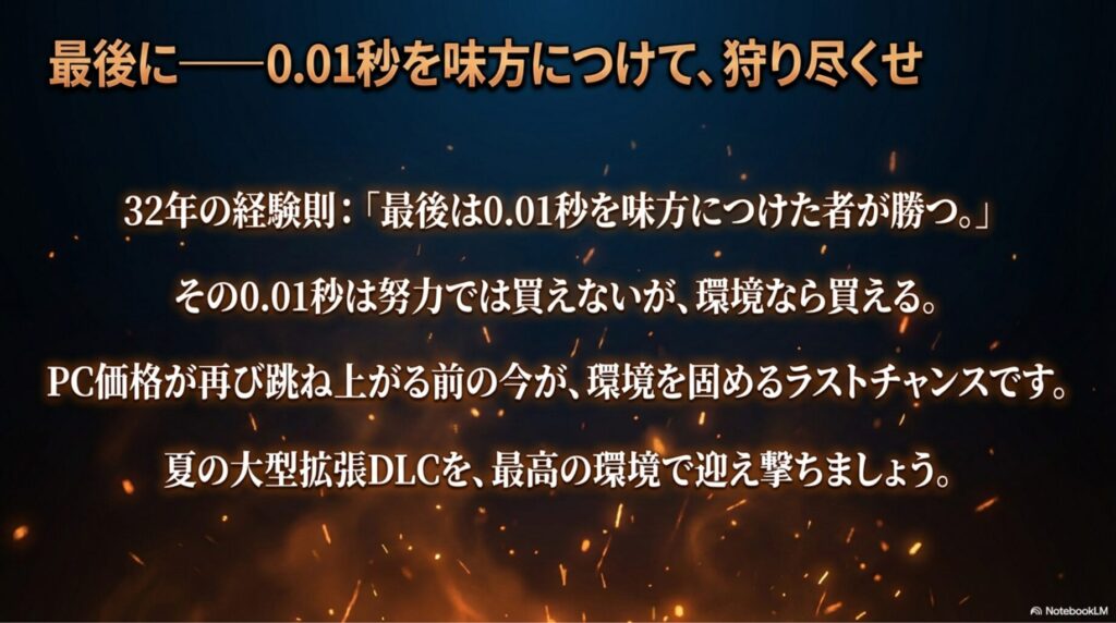 最後に——0.01秒を味方につけて、歴戦王を狩り尽くせ