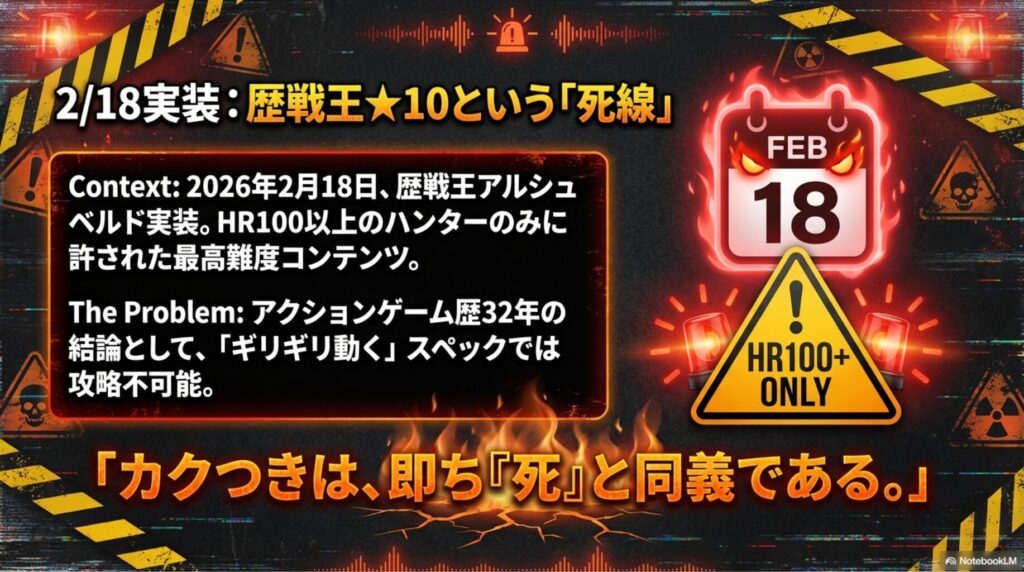 歴戦王アルシュベルドとの戦闘では、新モーションのパターン計算、環境オブジェクトの破壊処理、マルチプレイの同期——これらが同時に走ります。