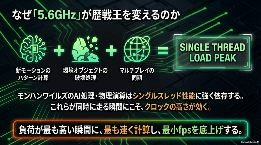 モンスターハンターワイルズのAI処理と物理演算は、シングルスレッド性能に強く依存します。