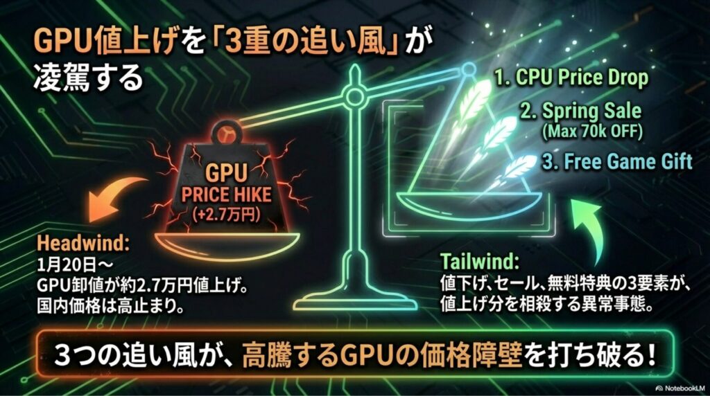 今回のCPU大幅値下げ(6,000〜10,000円規模)がGPU値上げを部分的に相殺。