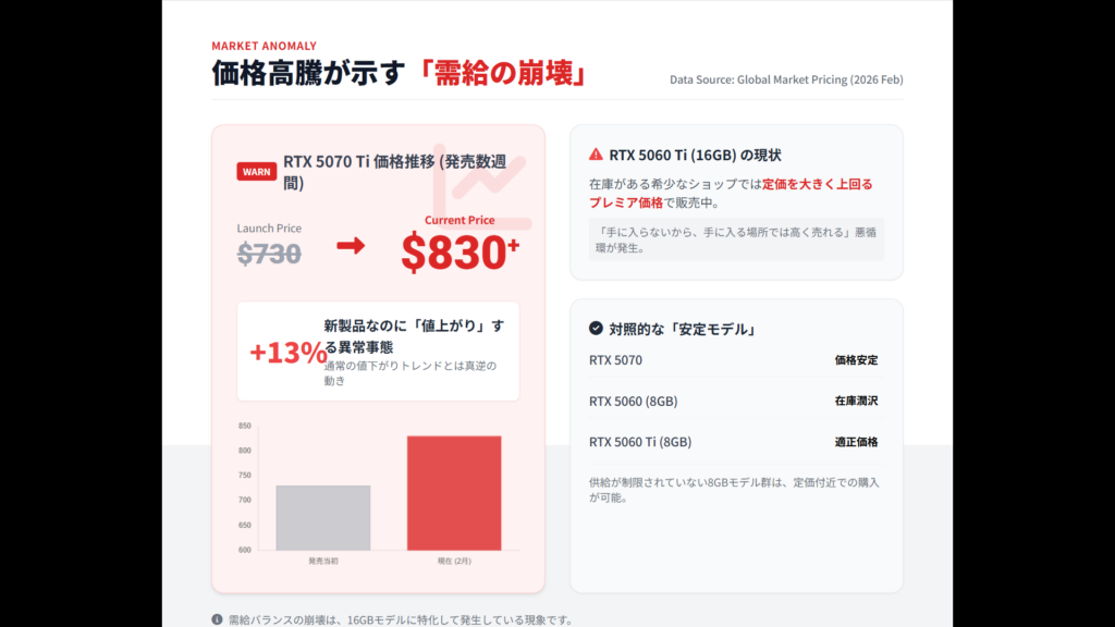NVIDIAにとって、多品種を少量生産する余裕はなく、メモリを贅沢に使う16GBモデルは真っ先に供給制限の対象となっているのが、2026年2月の残酷な現実です。