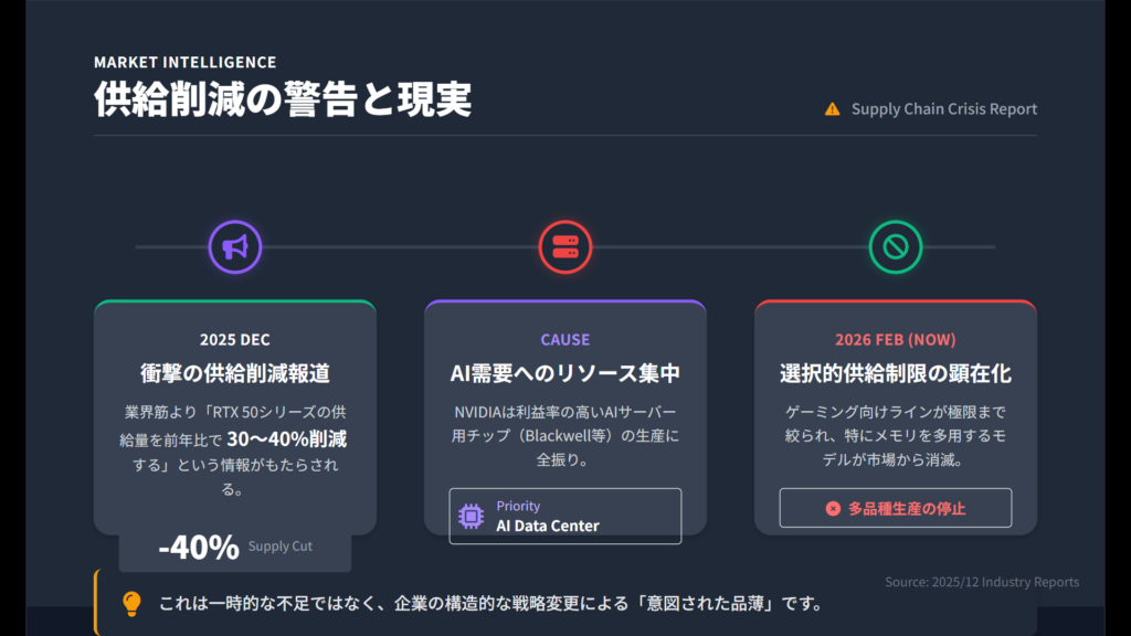 NVIDIAは現在、莫大な利益を生むAIサーバー用チップ(Blackwell等)の生産にリソースを全振りしており、ゲーミング向けラインを極限まで絞り込んでいます。