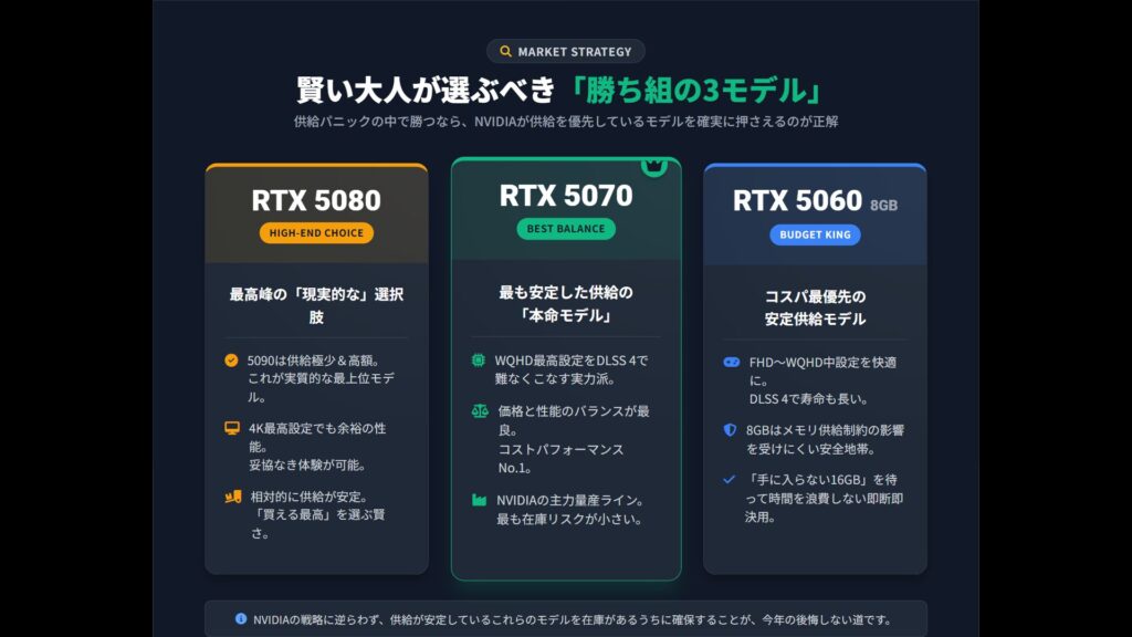 今、この供給パニックの中で「勝てる」選択をするなら、NVIDIAが供給を優先しているモデルを確実に押さえるのが正解です。