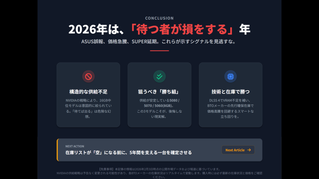 NVIDIAの戦略に逆らわず、供給が安定しているこれらのモデルを確実に確保することこそが、2026年で後悔しない唯一の道です。