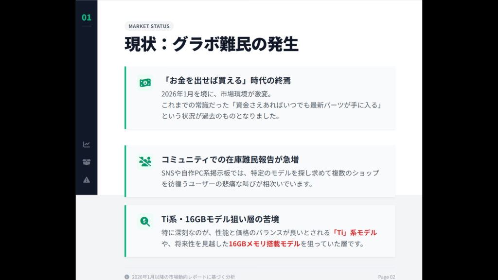 現在、SNSや自作PC系コミュニティでは、特定のモデルを探し求めてショップを彷徨う「グラボ難民」の報告が相次いでいます。
