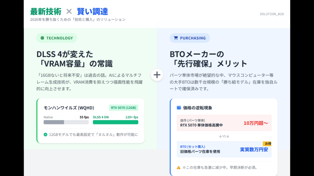 フレーム生成により実質的なフレームレートが大幅に向上するため、8GB〜12GBのVRAMでも、従来の16GBモデルと同等以上の体験が可能になっています。