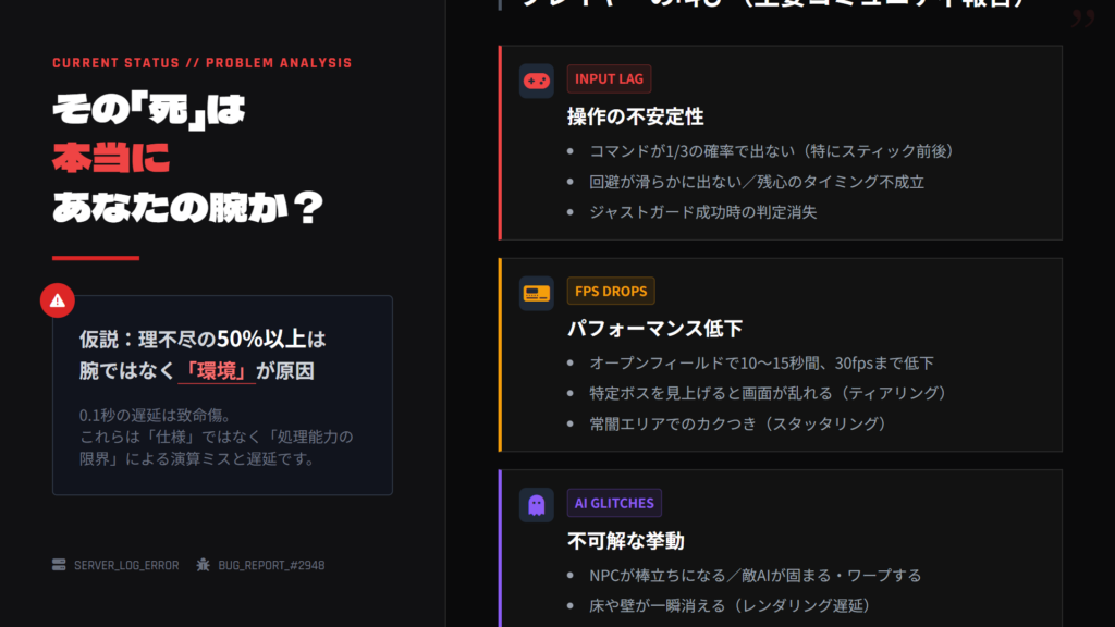 これらが重なると、あなたが「確実に押した」と思った入力が、ゲーム内では「なかったこと」にされます。