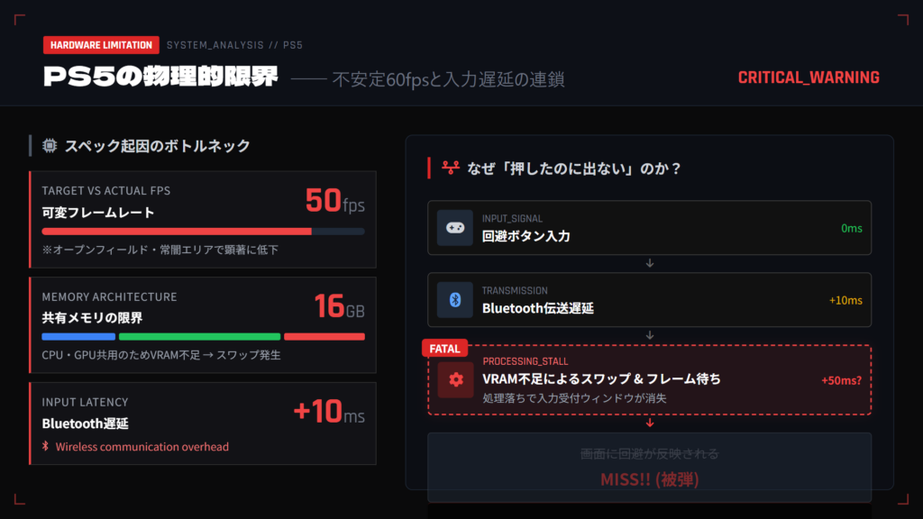 この原因は、PS5のBluetooth接続による入力遅延と、コンソール特有のVRAM不足による演算の待ち時間が重なっている可能性が高い。