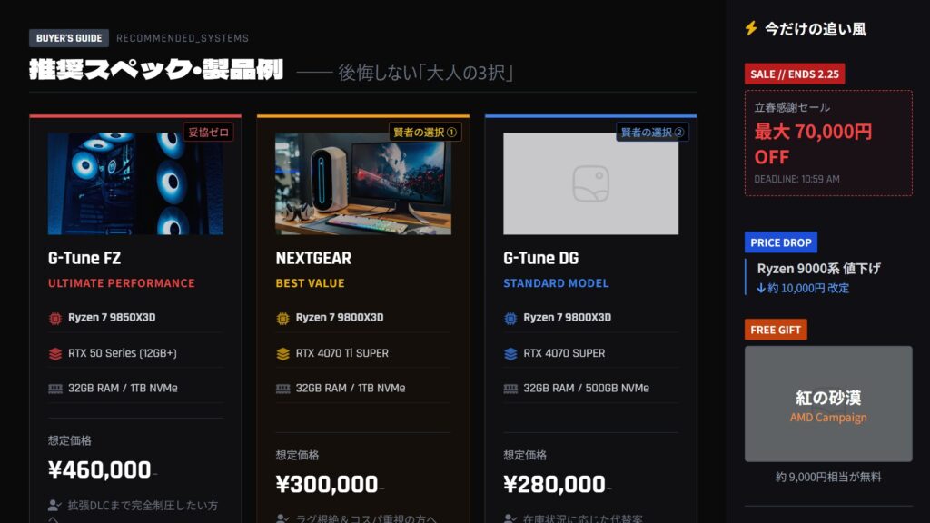 📱 [賢者の選択②:G TUNE DG(Ryzen 7 9800X3D搭載モデル)はこちら](マウスコンピューター公式)
