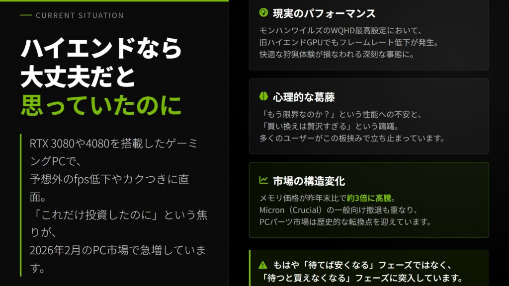 RTX 3080や4080を搭載したゲーミングPCで、モンスターハンターワイルズのWQHD最高設定を楽しもうとしたとき、予想外のfps低下やカクつきに直面した方は少なくないでしょう。
