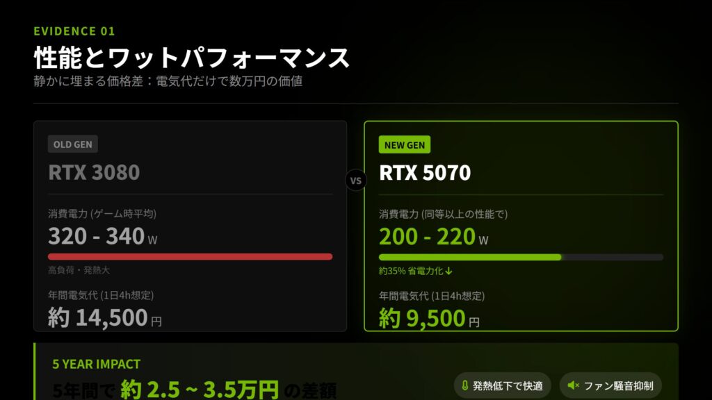 本記事では、RTX 5070への乗り換えが単なる「性能アップ」ではなく、電気代、体験の質、そして資産価値という観点から見て、いかに合理的な選択であるかを3つの証拠とともに検証します。
